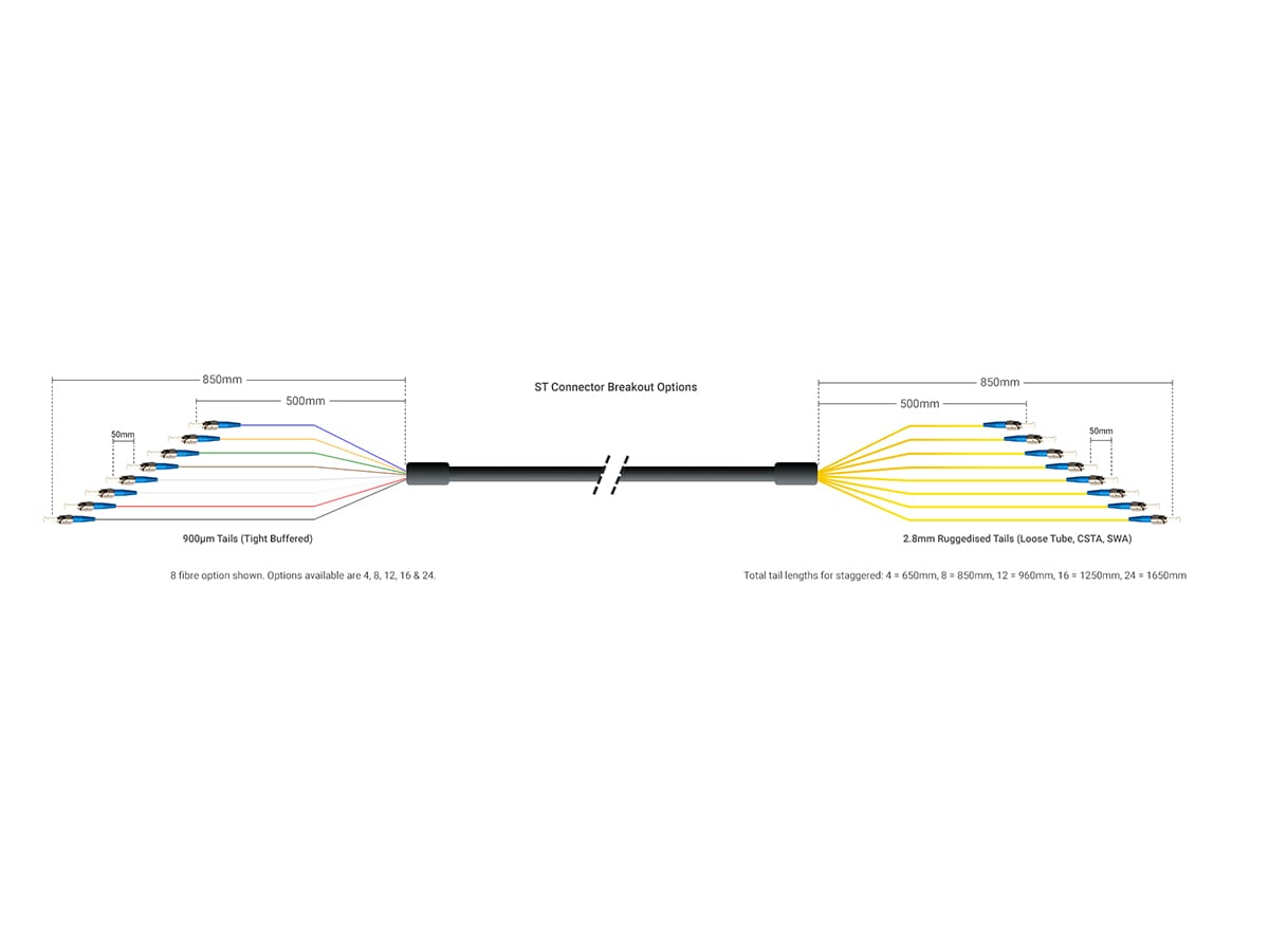 Pre-terminated fibre cables in multimode (OM1, OM3, OM4) or singlemode (OS2). The range includes indoor/outdoor cables available in 4-24 fibre with standard LC/SC/ST connectors.